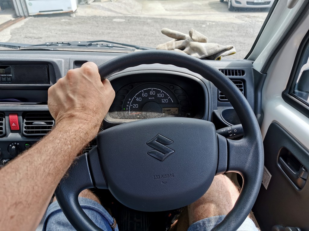 Ce type de « léger camion » est très présent dans les campagnes japonaises. On en voit partout, tout le temps. C’est le truc pratique pour transporter les outils, les récoltes, aller à la déchetterie, se déplacer sur les routes les plus étroites. L’engin est conçu comme un passe partout. Il a un rayon de braquage qui lui permet de faire demi tour sur un mètre carré (bon, ok, un peu plus…), et il peut passer en mode 4 roues motrices. Ouais, je conduis un 4×4 si je veux !