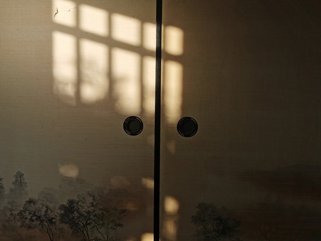 Lorsque je lève le nez de mon travail, je suis immédiatement transporté dans un autre lieu, voire un autre temps. Derrière mon écran s’alignent quatre fusuma, ces cloisons coulissantes et opaques (à ne pas confondre avec les shôji dont j’ai parlé précédemment) qui me séparent de l’atelier de Yoko. Deux paysages s’étalent chacun sur une paire de fusuma. Ils montrent une vallée dans un style simili sumi e (technique de lavis à l’encre noire utilisée au Japon depuis le VIIIe siècle). De part et d’autre d’une rivière qui se perd dans la brume, on aperçoit les toits en chaume de maisons traditionnelles.
