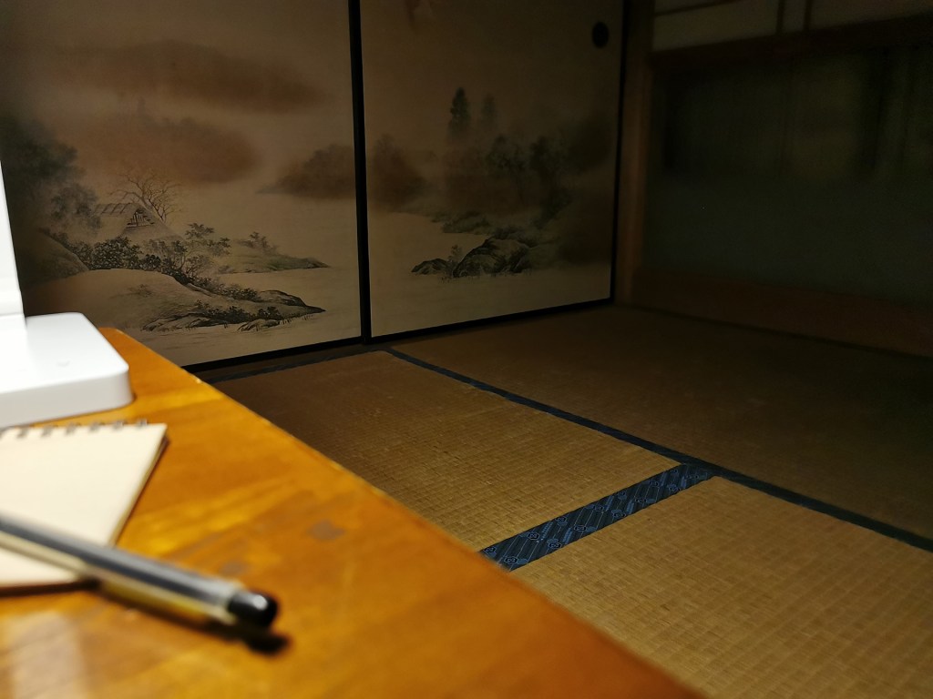 Le mobilier de la pièce se limite à l’essentiel. Je travaille sur une table basse, assis sur un zafu, parfois directement sur les tatamis. Je ne vais pas le cacher, la position est relativement inconfortable lorsqu’on a passé sa vie à s’assoir sur une chaise, mais… Mais quoi ? Je ne sais pas trop en fait. Je crois que le contact des tatamis y est pour quelque chose. À moins que ce soit le fait qu’une table et une chaise seraient parfaitement incongrus dans cet endroit ? La pièce est conçue pour vivre près du sol et, malgré mes genoux qui demandent grâce parfois, je me plie volontiers à l’usage du lieu. J’accepte le dépaysement. Mais je dois aussi accepter de me déplier douloureusement après quelques heures à bosser.