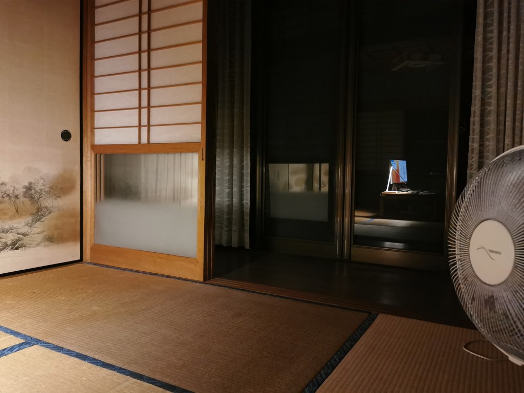 Outre les fusuma, mon bureau se ferme avec trois shôji qui le séparent du engawa. Le engawa est cette sorte de couloir qui dessert nos deux espaces de travail et qui sert de transition entre les pièces et le jardin. Le sol en est en parquet. Une grande baie vitrée ouvre sur le jardin. Mais ce soir vous ne verrez rien que le reflet de mon bureau…