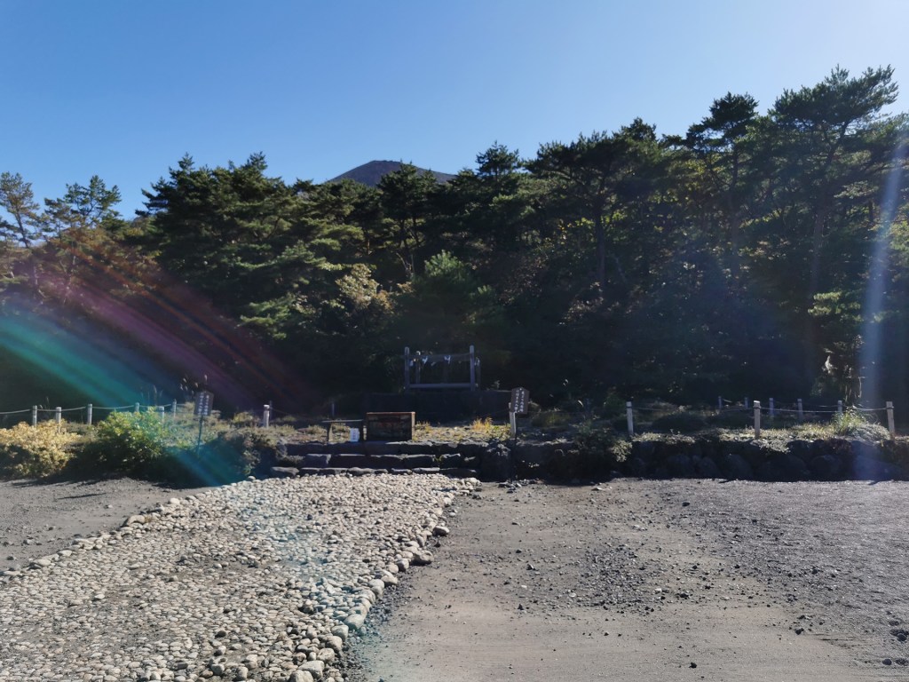 Nous commençons par visiter un temple… qui n’existe plus ! Bravo ! C’est bien parti… Pour comprendre, remontons un poil en arrière, en l’an 788. À ce moment-là, un premier temple édifié entre les monts Takachihonomine (1574 m) et Ohachi (1408 m), deux volcans, est détruit par une éruption. Un nouveau temple, le Furumiya-ato, est bâti à Takachiho-gawara (970 m d’altitude) à trois kilomètres de là. Évidemment, ce n’est pas beaucoup plus loin, et le temple est encore détruit dans une éruption du mont Ohachi en 1234. C’est bien ici que nous allons.