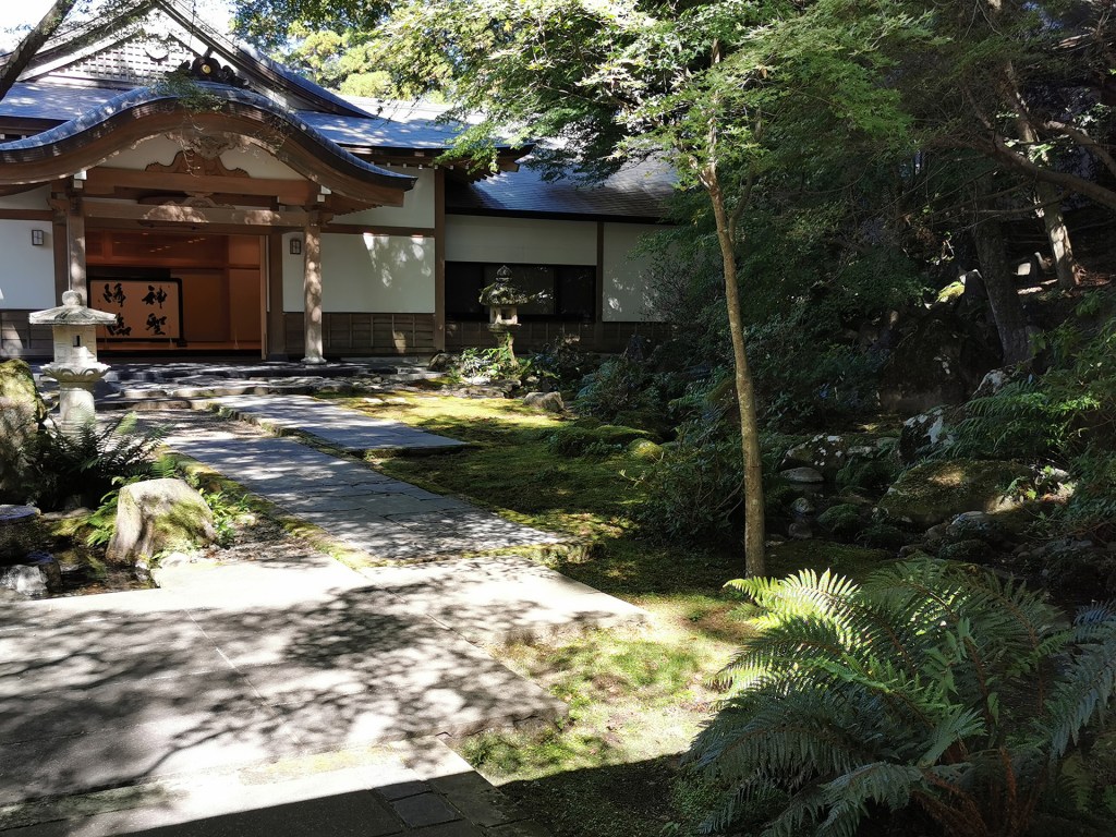 En contrebas du temple, des bâtiments traditionnels complètent le tableau. Derrière un portique, un jardin traditionnel avec un pavillon grand ouvert qui laisse voir une belle calligraphie.