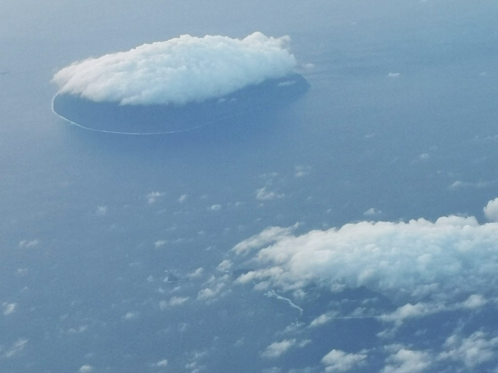 Nous descendons peu à peu au-dessus de l’océan Pacifique où des îles tentent de cacher leurs secrets sous des draps de nuage.