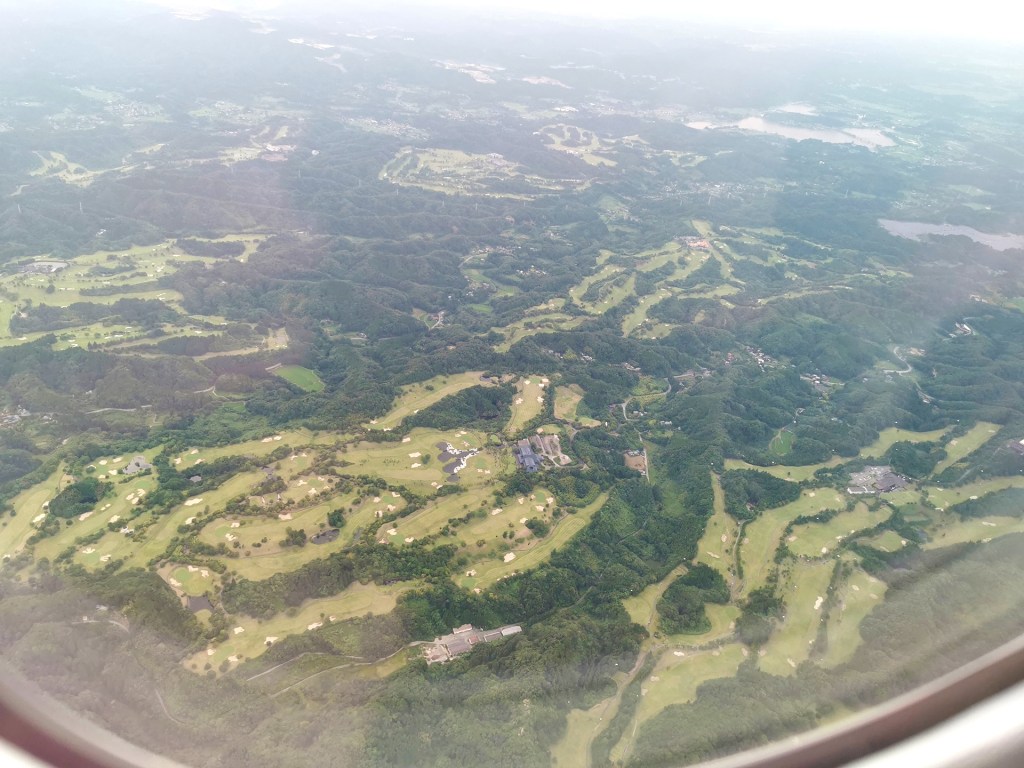 En arrivant aux abords de Tokyo, nous survolons des champs. Pas des champs de thé, pas des champs de riz, non, des champs de golf. Qui a dit que les japonais n’aiment pas le golf ? Sur la photo ci-dessous, il n’y a pas moins de 7 parcours !