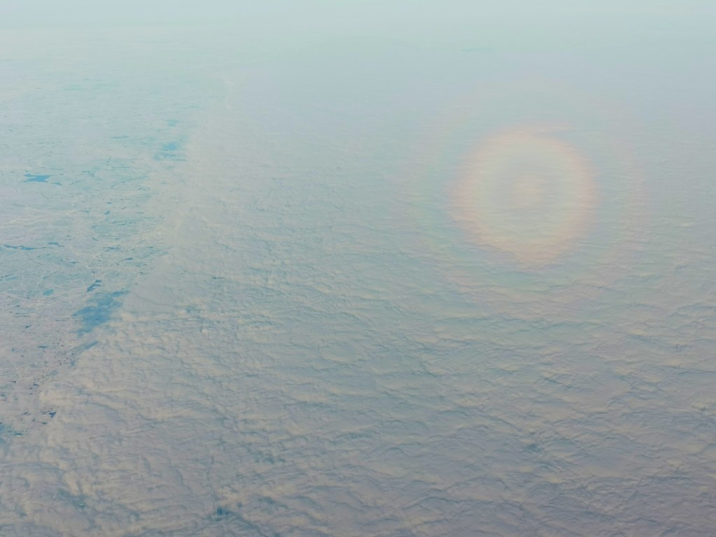 Nous survolons une mer de nuage dans laquelle la lumière du soleil se diffracte nous offrant le spectacle, rare pour des êtres aussi terre à terre que nous, d’un arc-en-ciel circulaire.