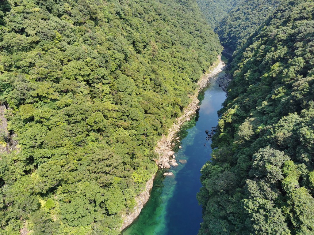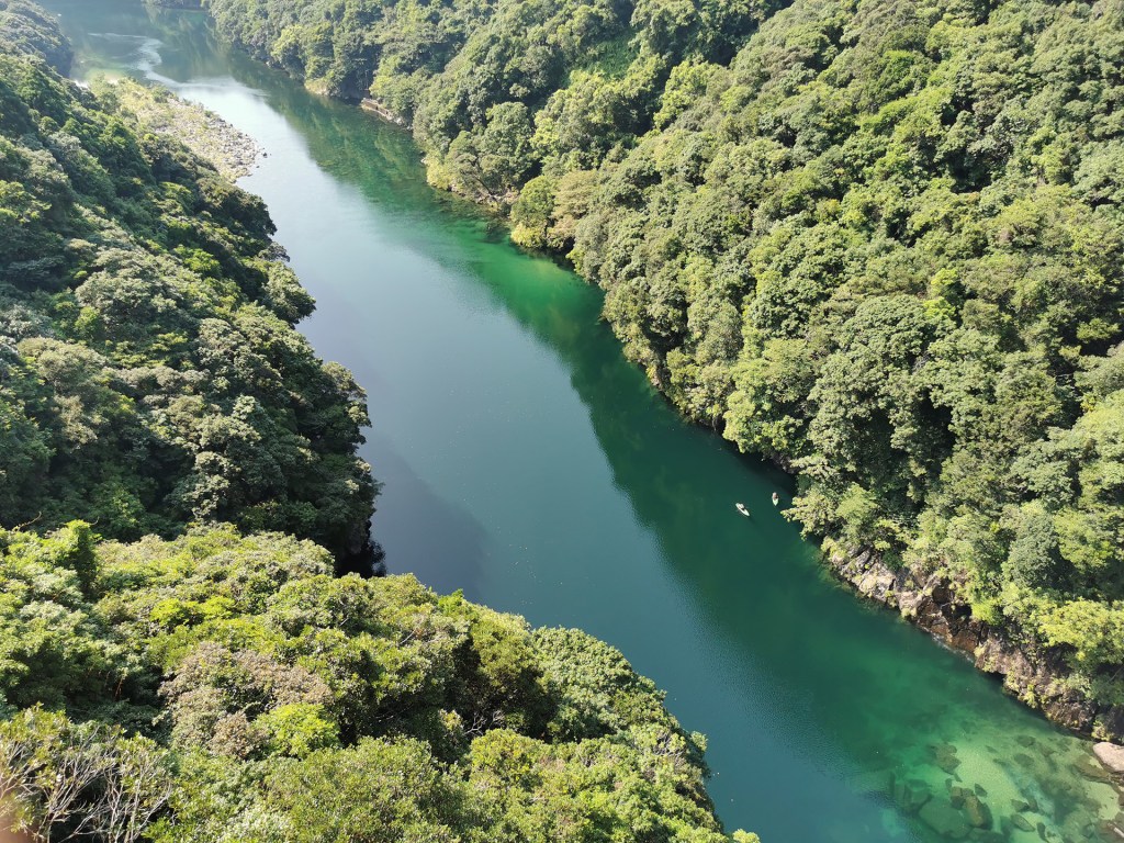 Reprenons notre récit. Nous entamons notre virée dans le sens des aiguilles d’une montre. Premier arrêt : Matsumine Ohashi. Il s’agit d’un pont sur la rivière Anbo qui offre une vue superbe. Outre la beauté des eaux, on peut constater le côté abrupt de la montagne et l’abondance du couvert végétal. Bien qu’il soit neuf heure et demie, il fait déjà très chaud, surtout sur un pont sans ombrage, et la tentation est grande de plonger. Seul le ratio entre la hauteur de la chute et la profondeur de l’eau nous retient.