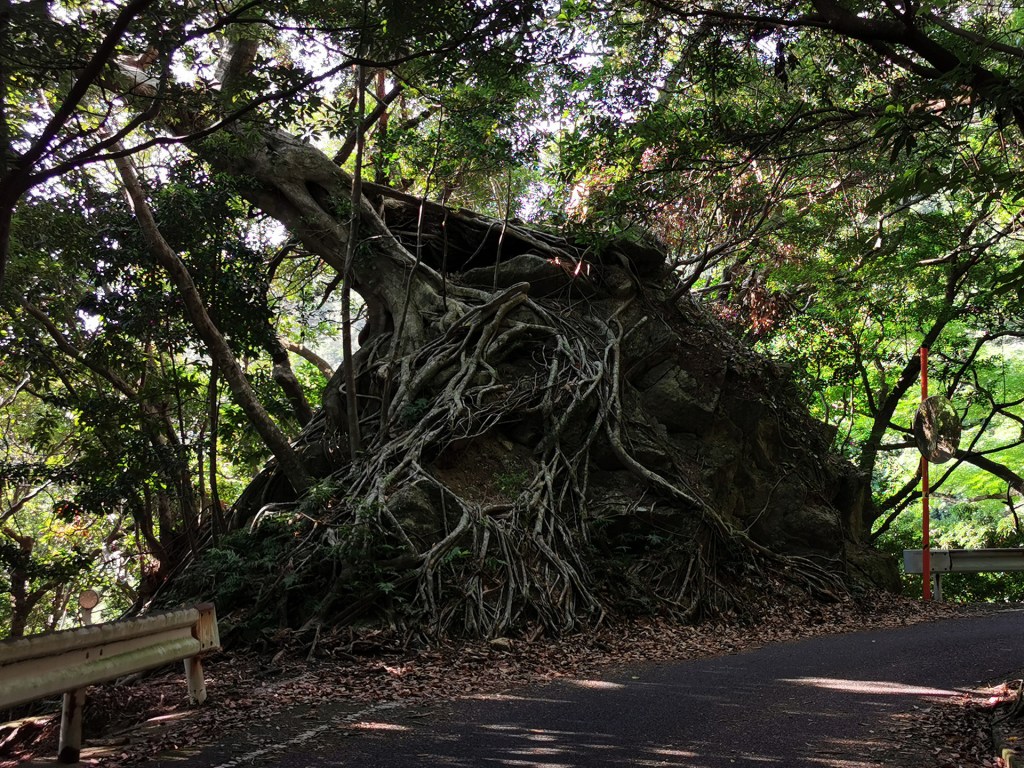 Nous reprenons la route une heure plus tard (et les pieds propres). Nous dépassons le terminus du bus pour emprunter l’unique route qui longe l’ouest de l’île. Cette petite route s’appelle Seibu rindo, la route forestière de l’ouest. Elle sinue à flanc de montagne sur environ 25 km, deux voiture ne peuvent s’y croiser à moins d’utiliser les espaces plus ou moins improvisés pour de telles situations. Il y a peu de paysages à admirer car malgré la topographie abrupte, nous sommes constamment en sous-bois. Il s’en dégage le sentiment d’un long tunnel vert.