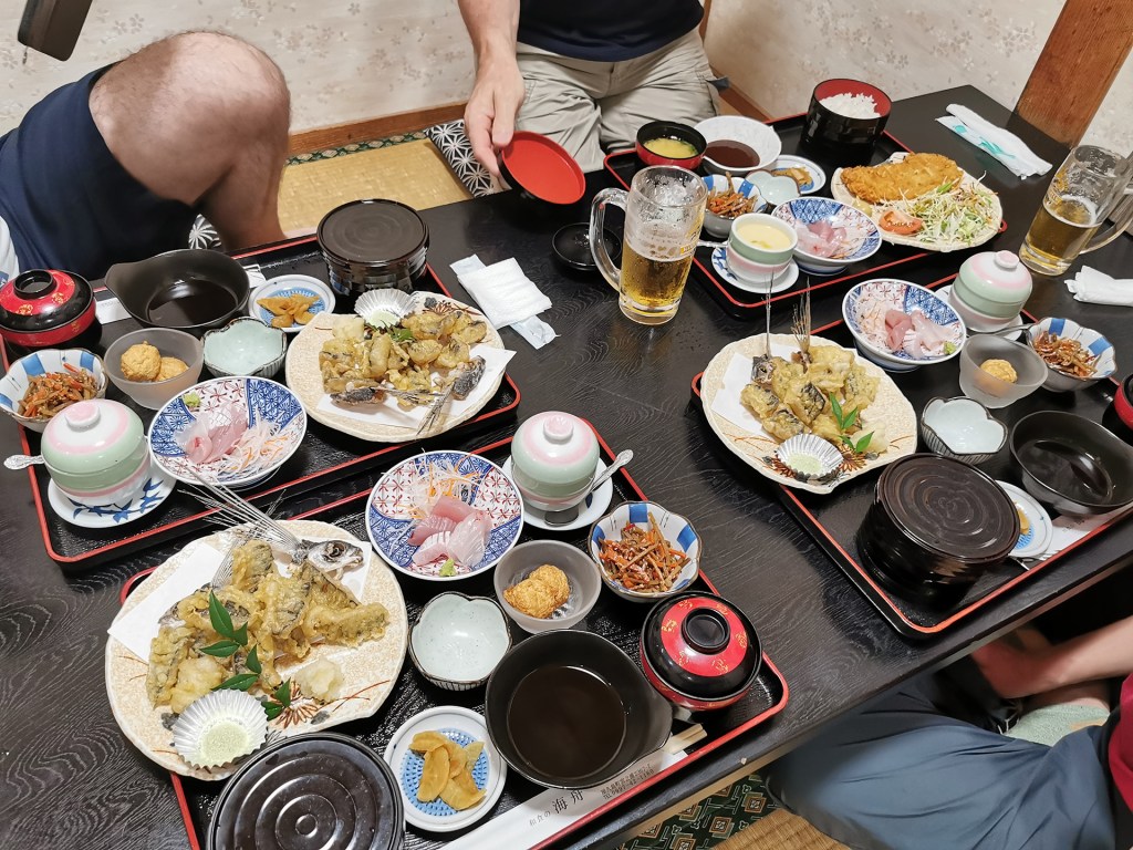 Nous finissons notre tour de l’île en admirant un joli torii sur fond de soleil couchant et, de retour à notre point de départ, tout finit en rires et en chansons autour d’un bon repas et d’une bonne bière.