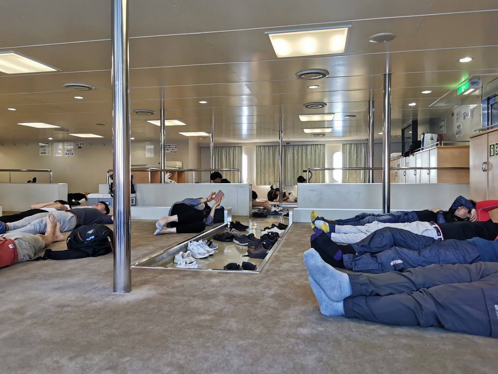 Chacun fait ce qu’il veut dans cet espace, mais évidemment, les japonais étant de bons amateurs de siestes dans les transports, pour eux c’est du grand luxe ici. Ils peuvent s’allonger et piquer leur somme, s’abandonnant aux bras de Morphée (surtout que Poséidon avait décidé de nous foutre la paix cette fois-ci). Et ça ronfle sans complexe à ma droite.