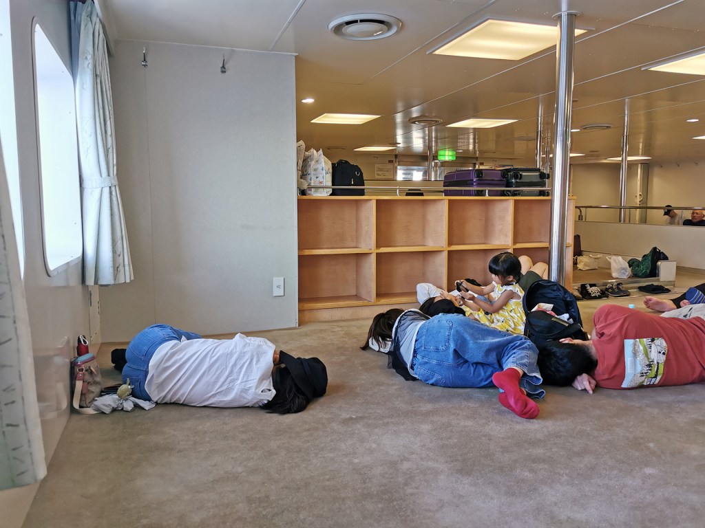 Pour nous rendre là-bas, il nous faut 1h30 de route pour rejoindre le port de Kushikino puis, de là, prendre le ferry. J’imagine que peu d’entre-vous ont eu l’occasion de prendre le ferry au Japon. De l’extérieur, rien ne ressemble plus à un ferry qu’un autre ferry. Mais à l’intérieur des ferry japonais, il y a des espaces qu’on ne trouve nulle part ailleurs. Plutôt que de me lancer dans des descriptions, voyez plutôt :
