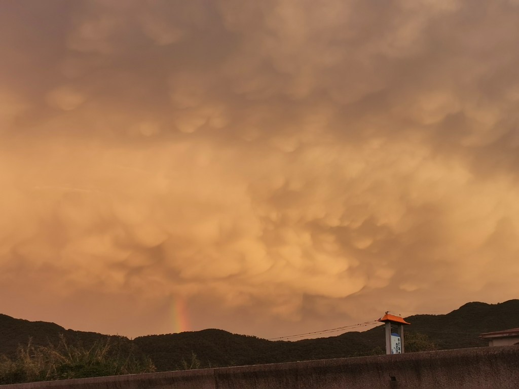 Le lendemain, je me suis aussi levé aux aurores, mais c’était une autre ambiance. Déjà, dans notre chambre régnait une drôle de lumière. En effet, dehors le ciel était teinté de rose orangé. La pluie s’annonçait pour la journée sous la forme d’un bout d’arc en ciel coincé entre la montagne et les nuages.