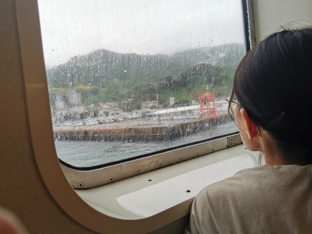 Nous embarquons avec nous notre fidèle Suzuki Swift, un atout essentiel pour se déplacer librement, les transports en commun ne permettant d’accéder qu’aux villages de l’archipel. Après 1h15 d’une mer calme, nous débarquons vers 12h30 à Sato, port principal de l’île de Kamikoshikijima, tout au nord. Ce port a la particularité d’occuper un isthme.