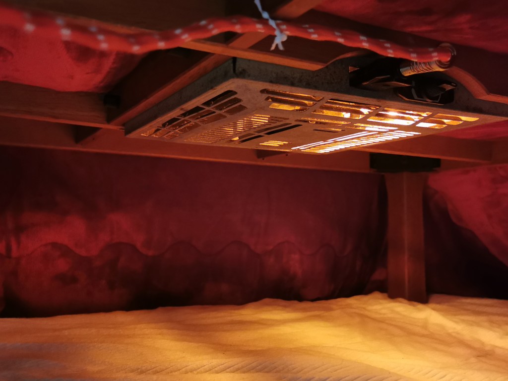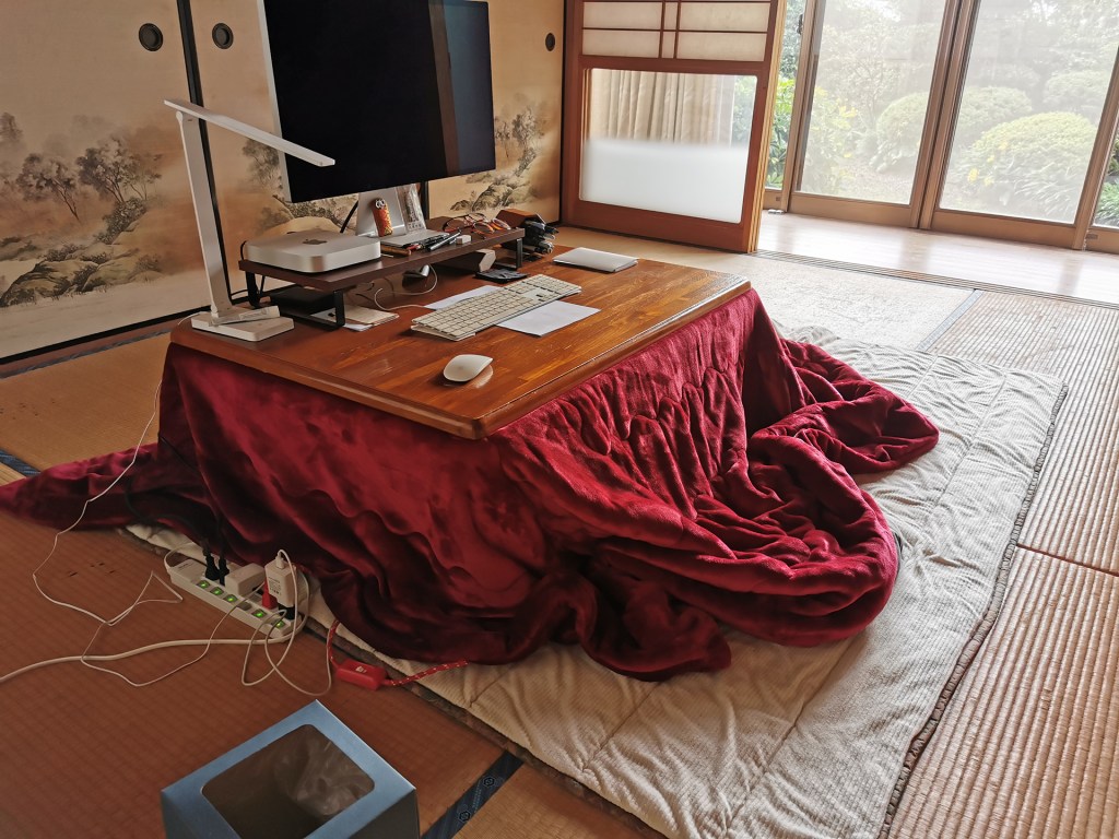 Et puis vendredi dernier, nous avons réinstallé le kotatsu. Pour rappel (j’en ai déjà parlé l’an dernier), sous mon bureau se trouve un chauffage électrique. Le plateau de mon bureau peut être retiré, on place une couverture sur le cadre du bureau au-dessus du chauffage et on remet le plateau par-dessus. Cette façon de chauffer a un côté très rustique mais donne de bonnes sensations. C’est pas un feu de cheminée mais il y a quelque chose comme ça. Une partie du corps est bien au chaud sous le kotatsu, le reste est plus dans l’air froid de la pièce. C’est très confortable et en même temps on sent pleinement la présence de la saison.