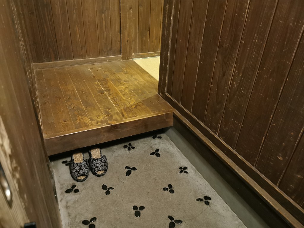 Passé l’entrée en chicane qui préserve l’intimité au cas où la porte serait ouverte de façon intempestive, on entre dans une petite pièce de trois tatamis.