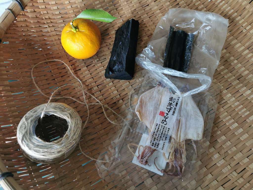 Le 31, mon beau père a confectionné le traditionnel shimenawa du nouvel an. Outre la corde de paille de riz, plusieurs composants entrent dans la fabrication. Ils sont bien entendu présents pour leurs aspects symboliques que je ne saurais vous expliquer là, tout de suite maintenant. En gros, on appelle la prospérité pour l’année à venir. On a donc un morceau de charbon, un bout d’algue, une mikan (orange) et de la seiche séchée (si ces six seiches ci sèchent sans souci, six cent seiches aussi sèchent sans souci, vous en conviendrez). Pour compléter la recette, on ajoutera des feuilles de fougère et de la ficelle pour servir de liant.