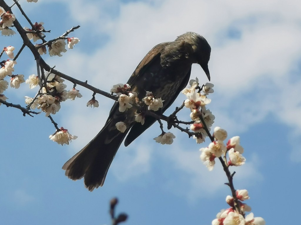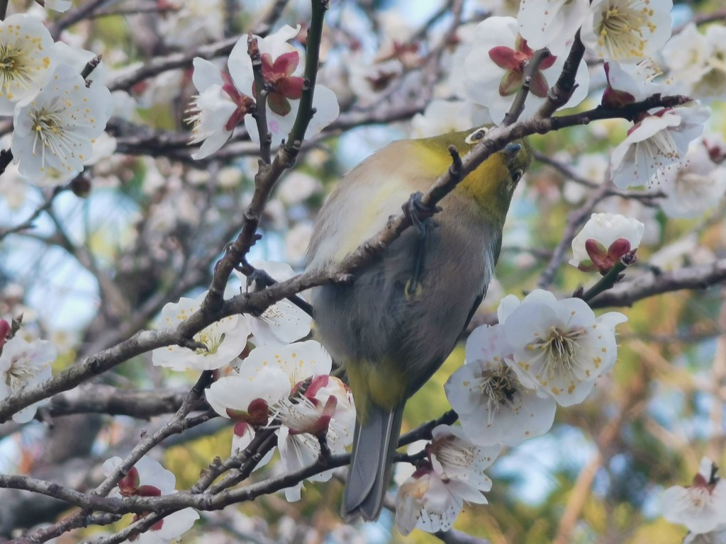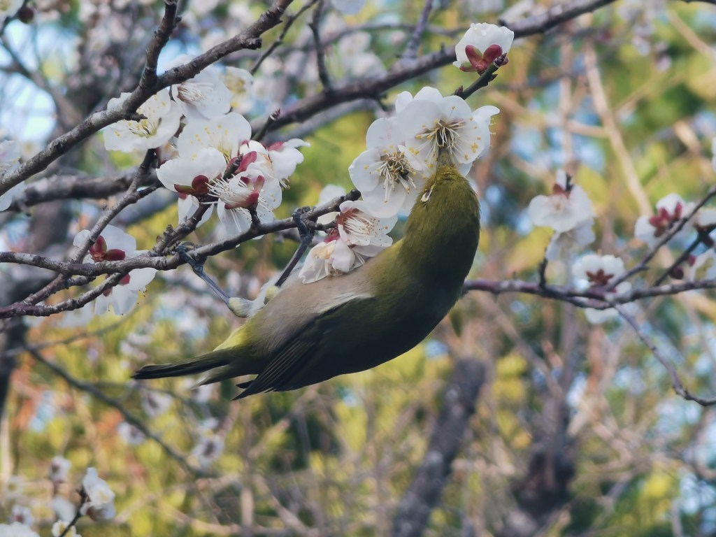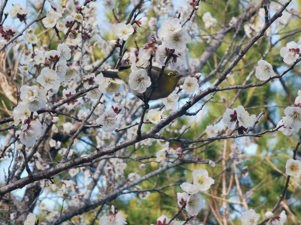 Après cet excellent repas, mes pérégrinations me conduisent au pied d’autres pruniers dans lesquels je peux observer des mejiro. (ah oui, tiens ! Je connais les moineaux, les autruches… et les mejiro). Je vous avais déjà montré un mejiro il y a un an (un an !) que nous avions pu voir dans un prunier à Tokyo.