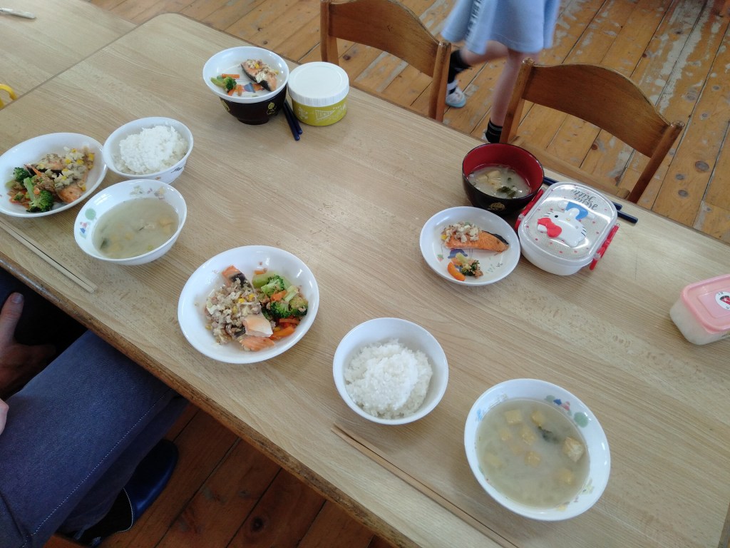 Ensuite nous passons à table. Le repas se déroule directement dans la classe, sur les tables où nous avons dessiné. Chaque élève va chercher son gobelet et une boîte dans laquelle il a amené son riz. Assiettes et baguettes sont fournies par l’école ainsi que le reste du repas : soupe de miso, légumes et poisson ce jour-là. À cet âge, les enfants sont servis, mais ils peuvent aller se resservir s’ils le souhaitent.