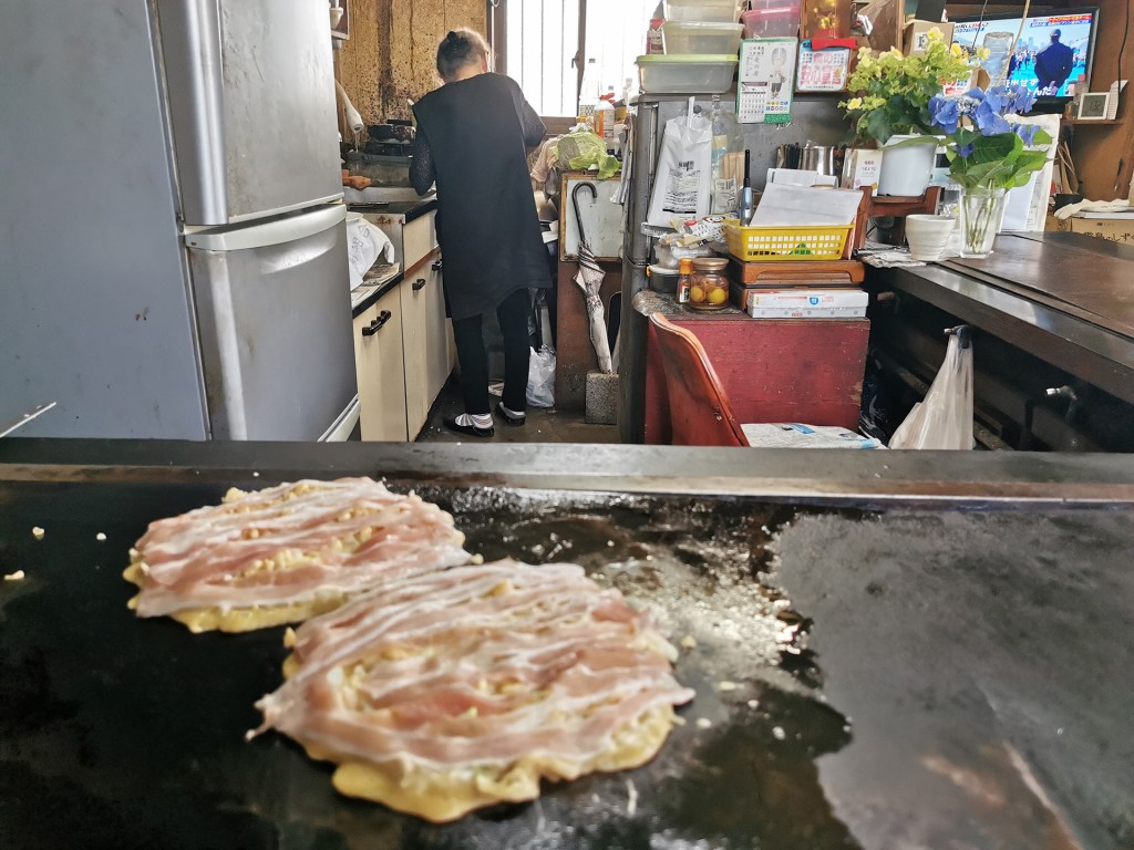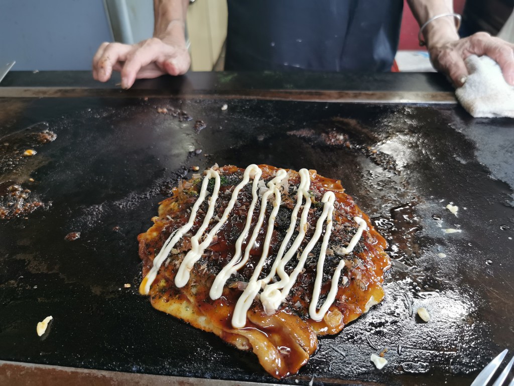 Elle a préparé nos okonomiyaki sur la plaque chauffante devant nous et les a badigeonnés de sa sauce maison. C’était trop salé ! Mais pour compenser, la note, elle, n’était pas du tout salée.